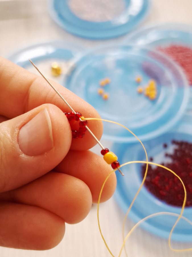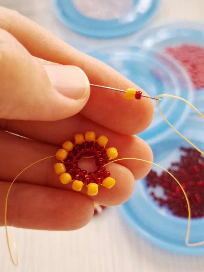 Náušnica sa vyšíva do kruhu z korálok dvoch rôznych veľkostí a vytvára krásny, pevný a rovnomerný tvar – ideálny pre drobné, jemné motívy.
