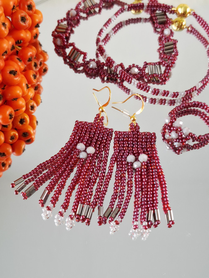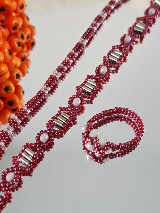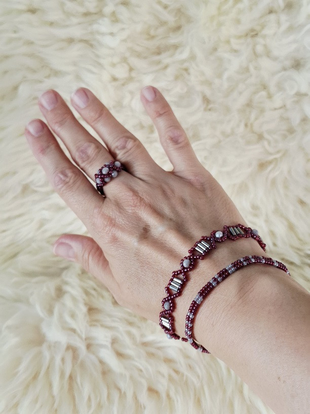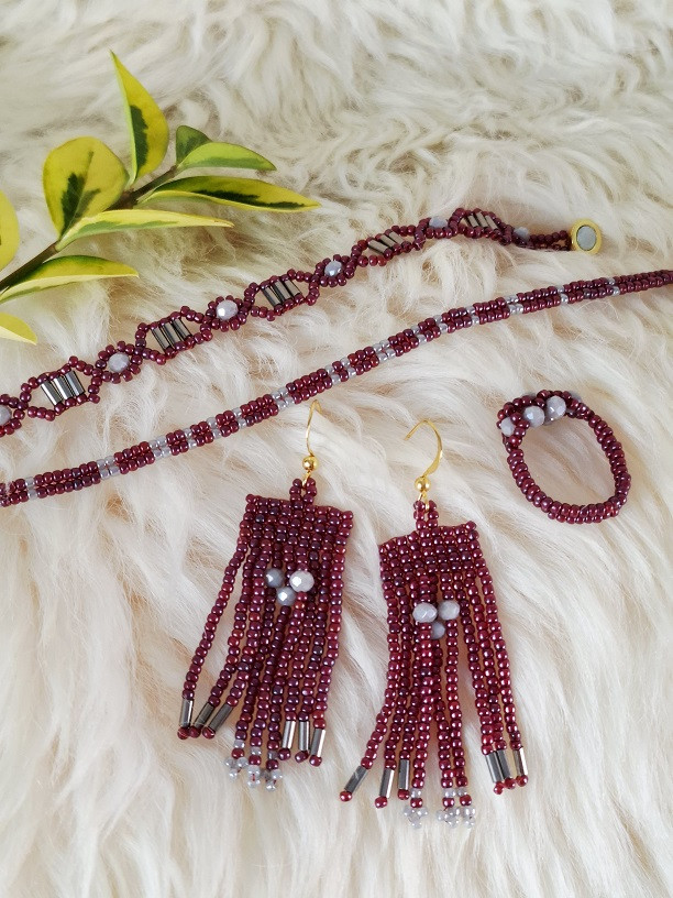 Objav set korálkových náušníc, náramkov a prsteňa, ktorý spája hlbokú bordovú ❤️ so sofistikovanou sivou 🌫️. Bordové koráliky sa jemne lesknú a odrážajú svetlo ☀️, zatiaľ čo drobné sivé ohňovky 🔥 dodávajú šperku tajomnú eleganciu.