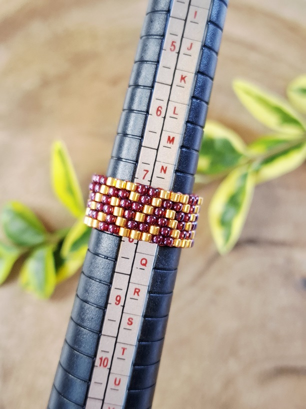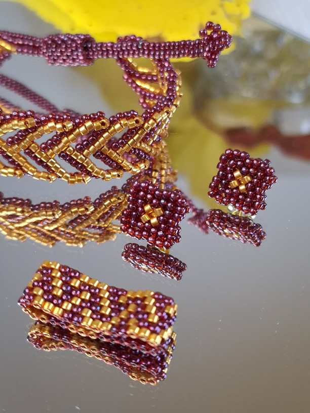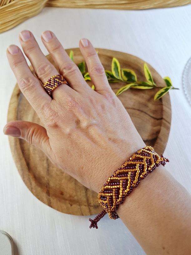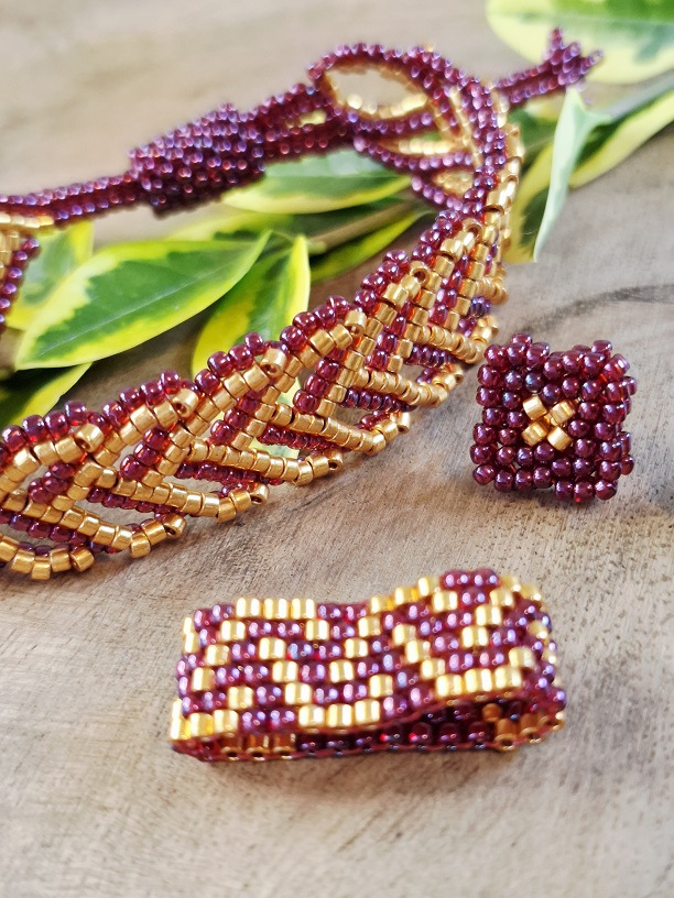 Objav set korálkových náušníc, náramkov a prsteňa, ktorý spája hlbokú bordovú so žiarivou zlatou. Bordové korálky sa jemne lesknú a odrážajú svetlo, zatiaľ čo zlaté drobné korálky dodávajú šperku noblesnú eleganciu.