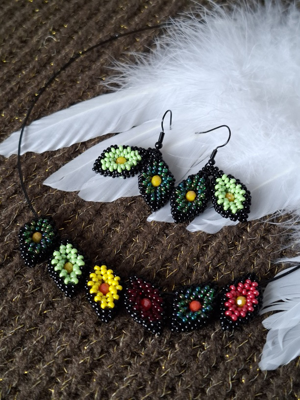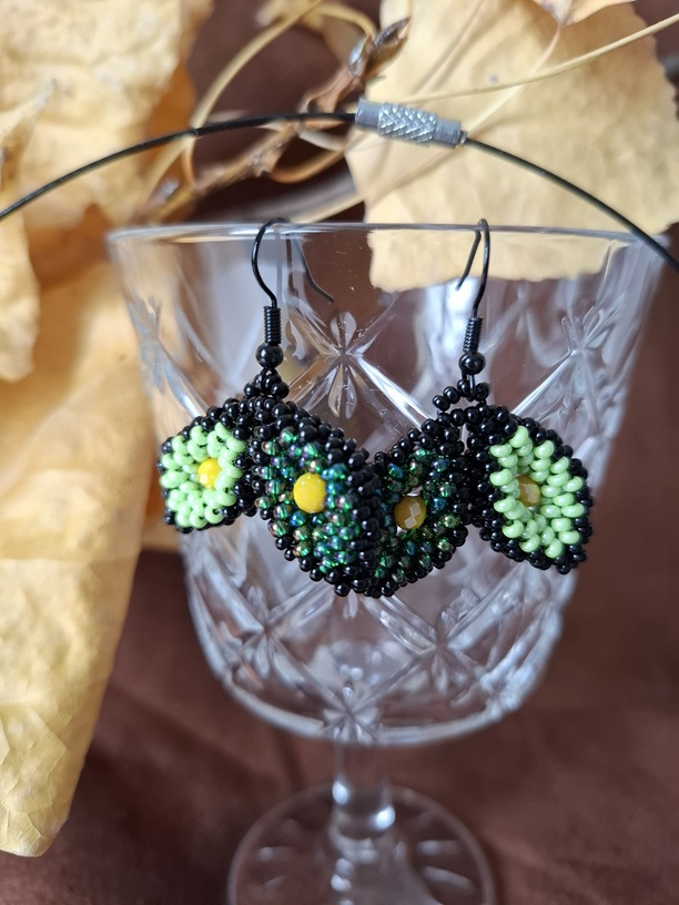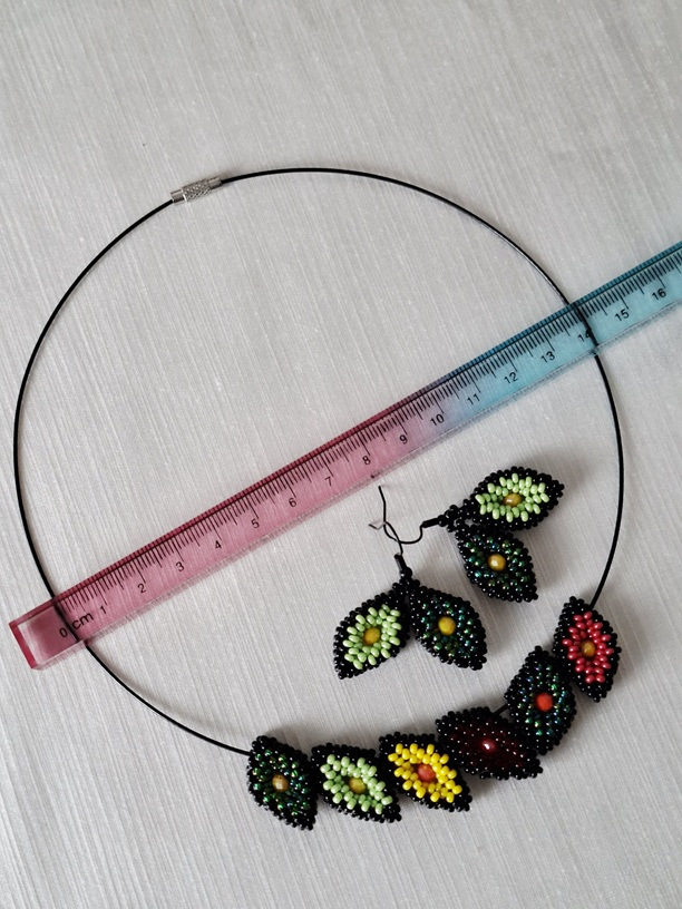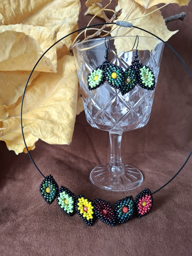 Tento set náušníc a náhrdelníka spája hĺbku čiernej s teplom jesenných farieb – vznikol tak doplnok, ktorý pôsobí tajomne, sofistikovane a mimoriadne pôvabne. 🍁🖤