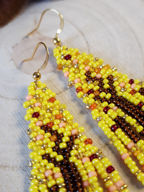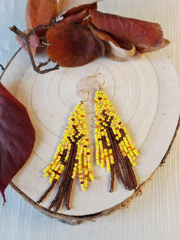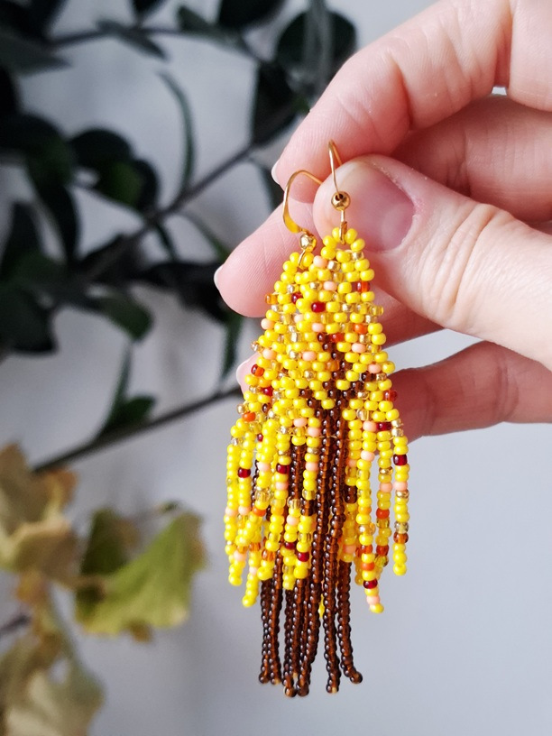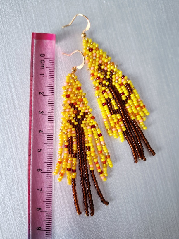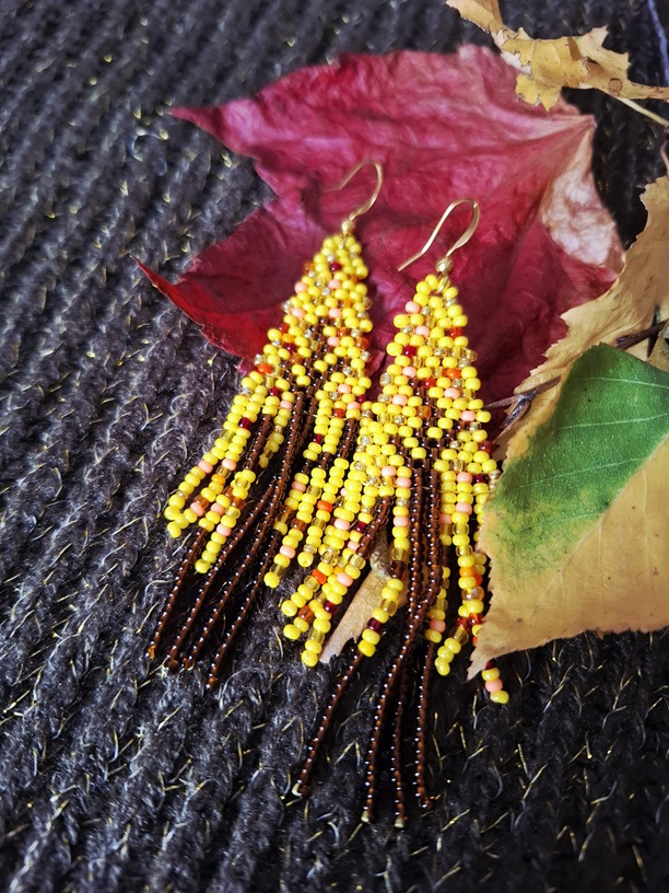 Tieto náušnice v tvare žltého jesenného stromu sú malé kúzlo, ktoré ti okamžite rozžiari deň. Použila som pestrú paletu korálok – od zlatých a žltých až po jemné odtiene oranžovej a červenej. Výsledok pôsobí netradične, no na uchu sú prekvapivo čarovné, jemné a hrejivé.