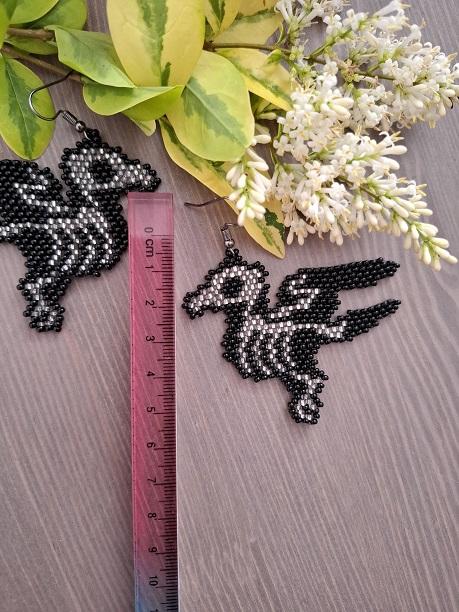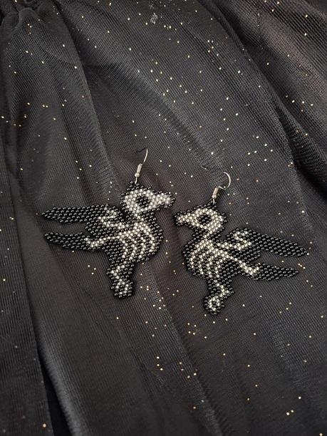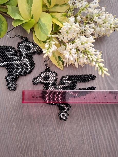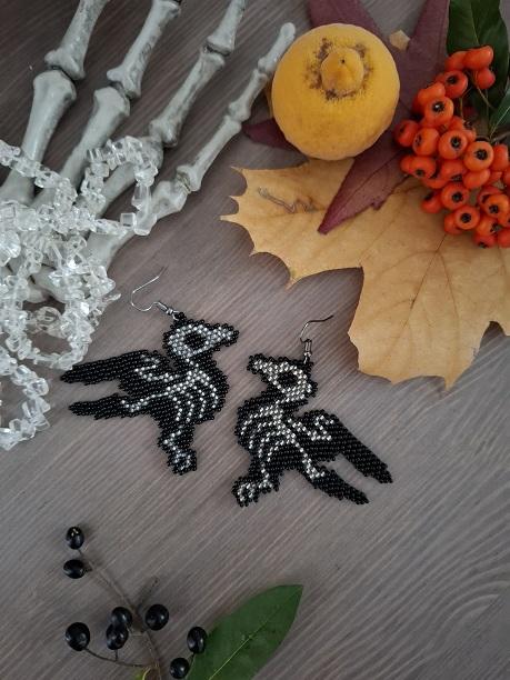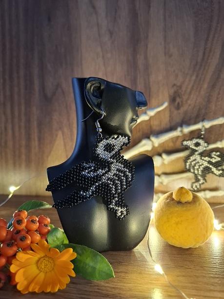 Kostry rôznych veľkostí už tradične patria k Halloweenskemu sviatku. Pre lepšiu predstavu, ako šperk vyzerá, si pozrite fotografiu so šperkom na ušku. Na fotografii s centimetrom môžete vidieť jeho skutočnú veľkosť, nakoľko busta má výšku iba 10 cm. Vzor vytvárajú plné čierne koráliky a priesvitné so strieborným prieťahom.