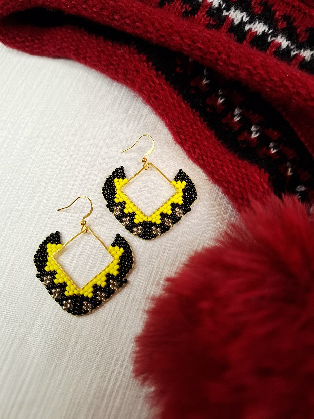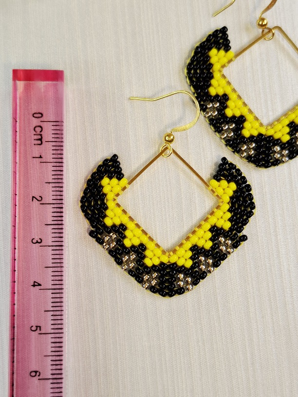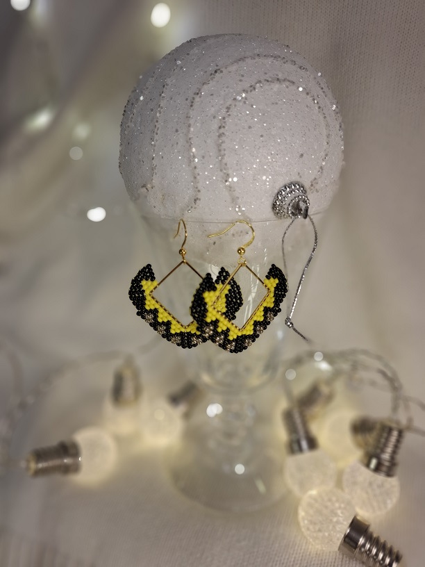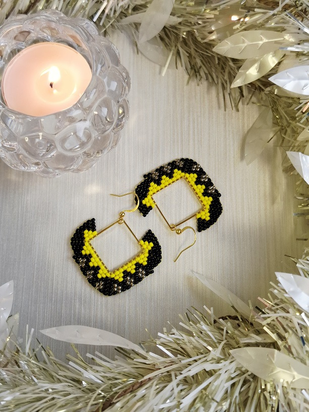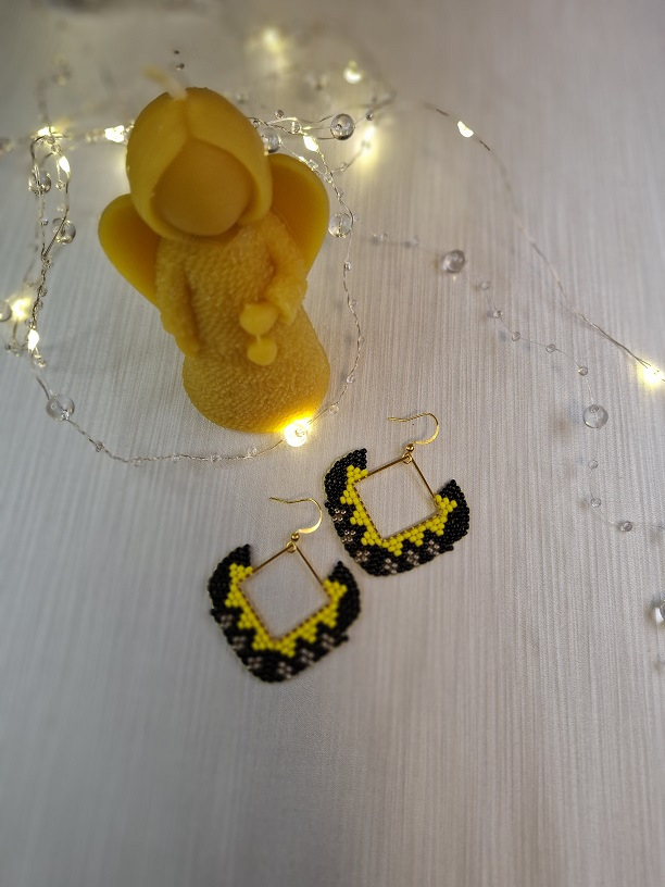 Tieto náušnice patria do série Kovové siluety, kde sa korálky spájajú s pevným kovovým rámikom zo šperkárskeho kovu, čím vzniká moderný a nadčasový dizajn. Použila som kvalitné české sklenené korálky v hladkej čiernej, ktorá sa hodí ku všetkému, doplnené o žlté trojuholníky a jemnú dymovo-platinovú farbu.