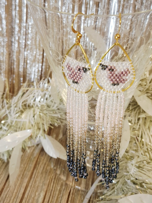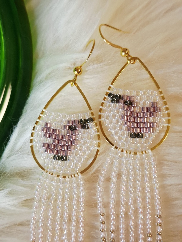 Tieto dlhé korálkové náušnice sú ako malý príbeh, ktorý nosíte na ušku. Uprostred rámiku v tvare slzičky sedí drobný vtáčik 🐦, odpočíva na konáriku a potichu si spieva svoju pesničku – presne tú, ktorá vnesie do vášho dňa pokoj aj štipku hravej energie.